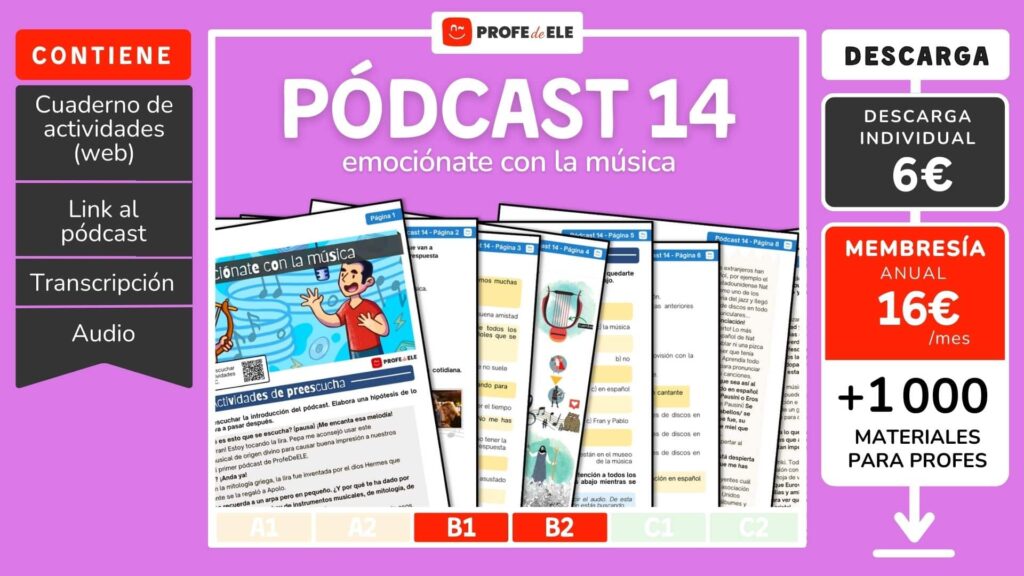 En esta página encontrarás el episodio 14 de nuestro pódcast para aprender español de nivel B1-B2. En esta ocasión, Fran y Pedro hablan de la música mientras Pedro aprende a tocar la lira. A lo largo de 14 ejercicios se practican las 4 destrezas de la lengua (comprensión auditiva, comprensión lectora, expresión oral y expresión escrita), con especial énfasis en la comprensión auditiva. Los primeros 6 ejercicios sirven de ayuda para contextualizar el tema del pódcast e interiorizar el vocabulario necesario para comprender mejor el audio. A esto le siguen 4 actividades que las y los estudiantes deberán completar escuchando simultáneamente el pódcast. Por último, encontrarás 3 ejercicios para practicar la lengua oral o la lengua escrita una vez escuchado el pódcast completo, así como un test de autoevaluación para que las y los estudiantes comprueben de manera autónoma cuánto han aprendido.