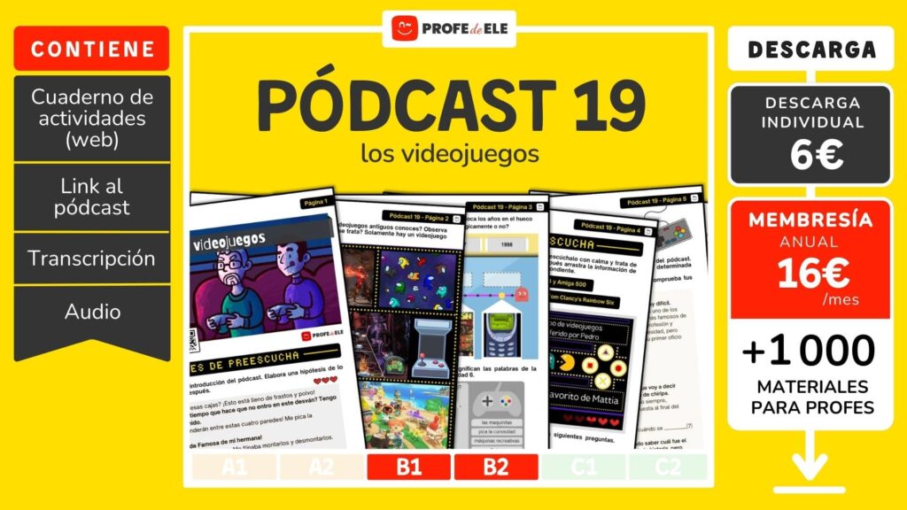 ¡Hola, profe! Aquí tienes las actividades online de español de nivel intermedio (B1-B2) para aprender y practicar el lenguaje de los videojuegos, hablar sobre recuerdos de infancia y reflexionar sobre cómo cambian los juegos a lo largo de las generaciones. Esta secuencia trabaja la expresión y la comprensión, tanto oral como escrita, a través de 13 actividades interactivas. Es un contenido completo y dinámico para estudiantes de Español como Lengua Extranjera (ELE). Esta es la entrada número 19 de la serie de podcast de ProfedeELE, ideal para el aprendizaje conectado con la cultura popular.