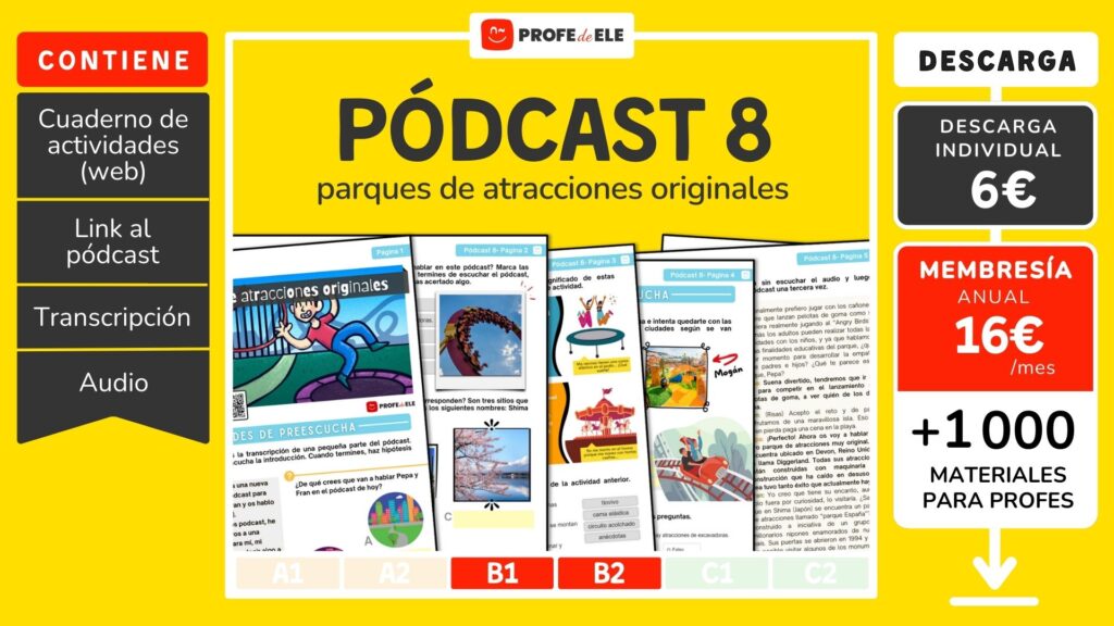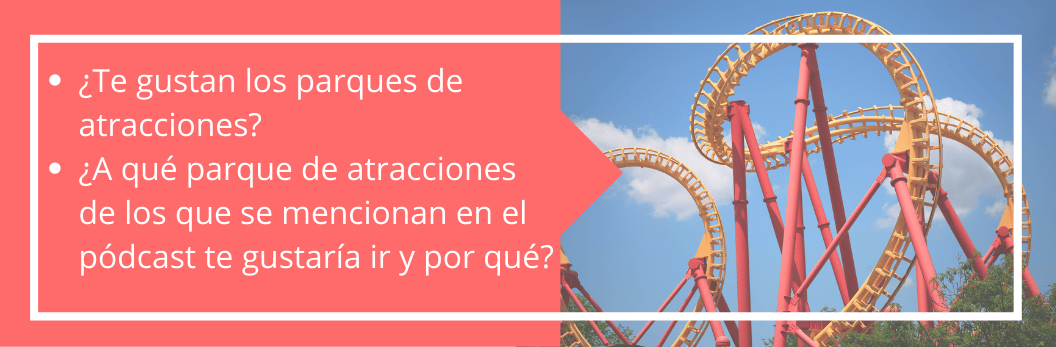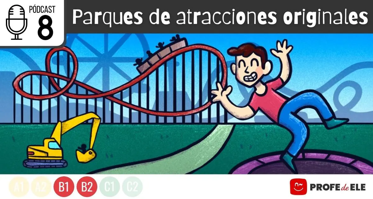 Actividades online de español nivel B1-B2 para aprender y practicar el léxico relacionado con los parques de atracciones que trabaja la expresión y comprensión, tanto oral como escrita a través de 10 actividades interactivas online. Es un contenido completo y dinámico para estudiantes de Español como Lengua Extranjera (ELE) de nivel B1 y B2. Esta es el episodio número 8 de la serie de podcast de ProfedeELE (hay más de 20 episodios).