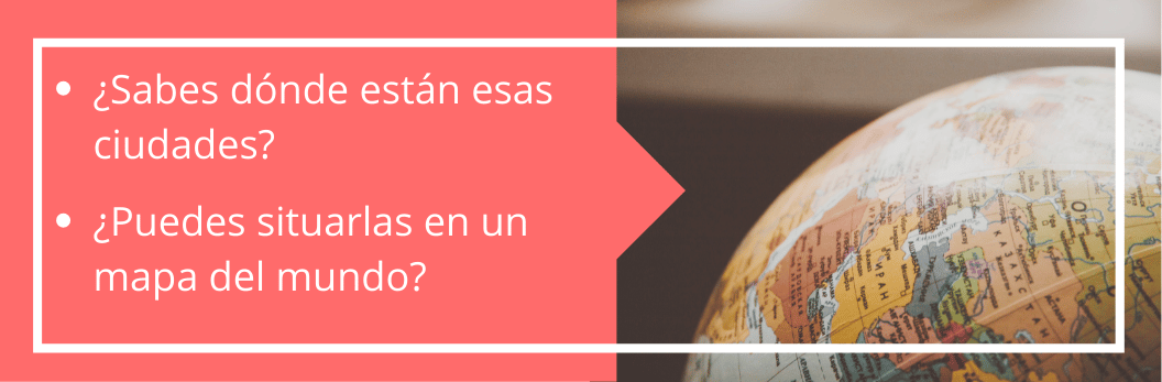 En el pódcast se mencionan varios nombres de ciudades y países. Colócalos en el orden en el que se mencionan.