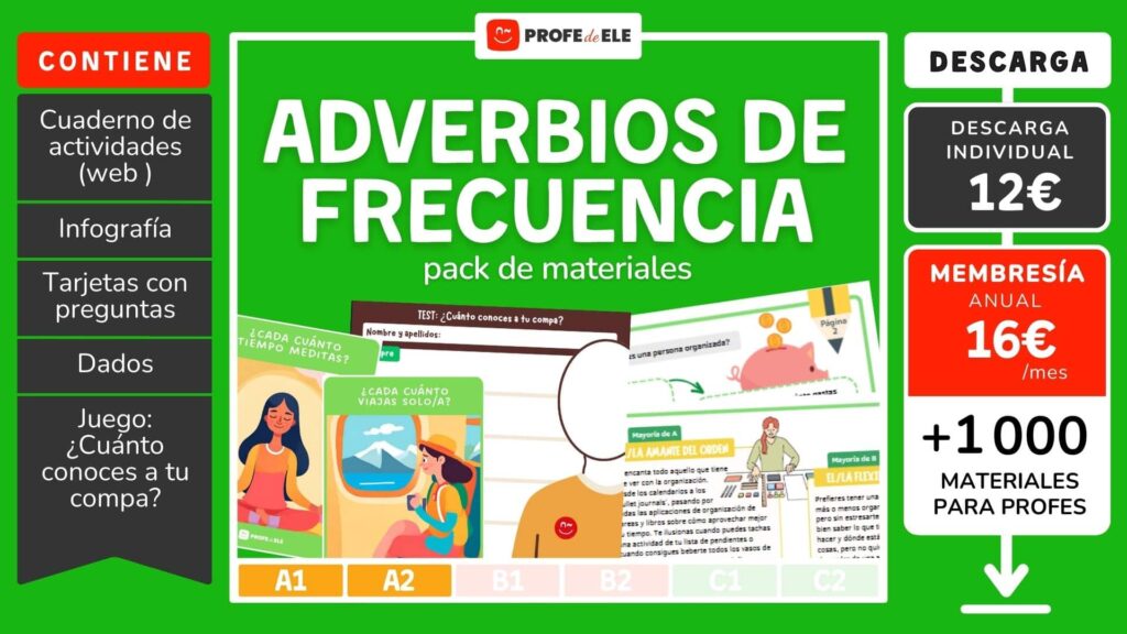 Esta secuencia didáctica sobre los adverbios y las locuciones adverbiales de frecuencia en español tiene como objetivo presentar las fórmulas para hablar de periodicidad más habituales y ofrecer diferentes ejercicios para las clases de enseñanza de español como lengua extranjera. Si ya conoces nuestras entradas de vocabulario (Acciones habituales, Verbos de uso común), sabrás que estas secuencias didácticas incluyen, por un lado, una explicación visual, normalmente en forma de infografía, donde se presenta una selección de no más de 15-20 palabras en español sobre el tema. Esta secuencia incluye además 10 ejercicios interactivos en distintos formatos y un conjunto de descargables.