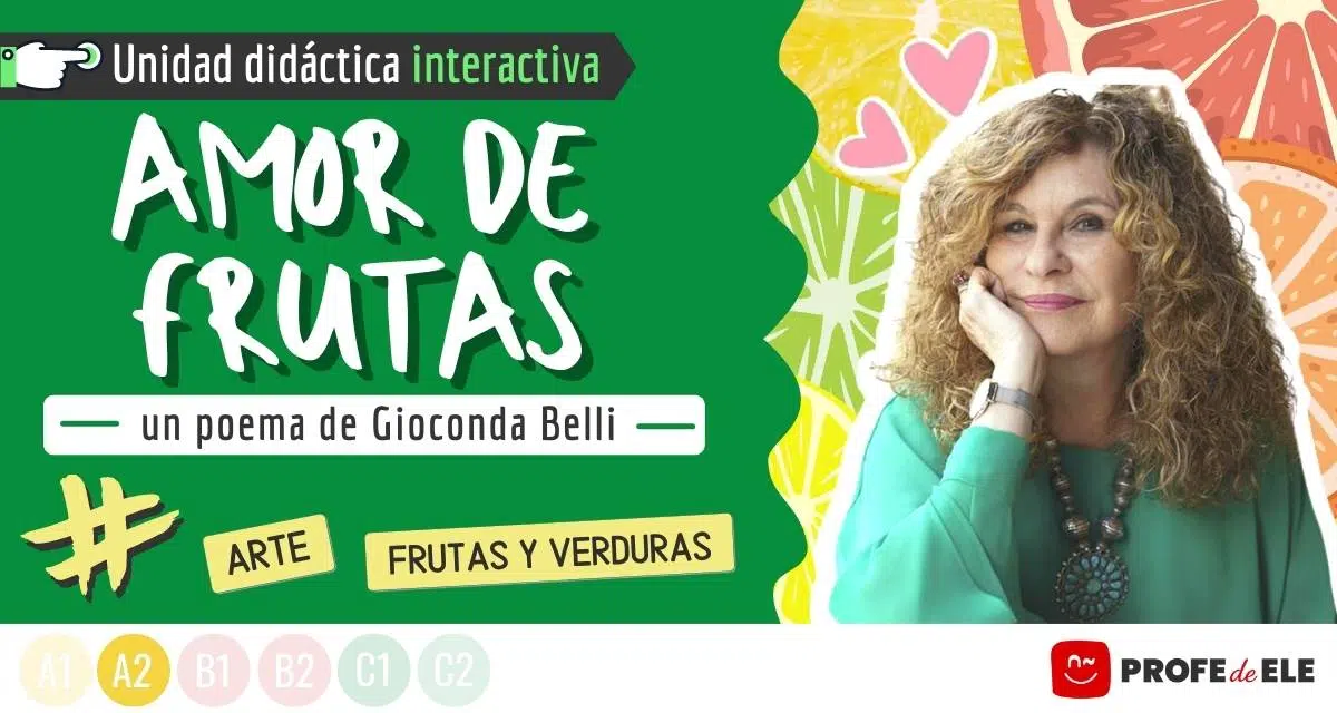Escucha el poema Amor de frutas de Gioconda Belli y completa con los nombres de frutas anteriores en plural. Fíjate en la imagen de la derecha: hay una fruta que no aparece en el poema… ¿cuál es?