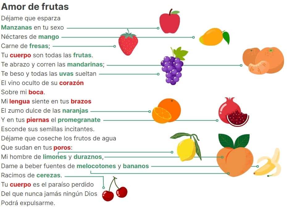 En Amor de frutas hay dos isotopías. Las hemos marcado en verde y en rojo. ¿Cuáles crees que son?