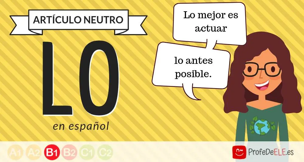 [vc_row][vc_column][vc_column_text]En español existen tres artículos: masculino (el), femenino (la) y neutro (lo). En esta entrada vamos a estudiar este último. Un artículo que es invariable, es decir, siempre va en singular y tiene capacidad de sustantivar adjetivos y determinadas oraciones de relativo. Vamos a estudiarlo a fondo:[/vc_column_text][/vc_column][/vc_row][vc_row][vc_column width=”1/2″][vc_column_text css=”.vc_custom_1569614753210{padding-top: 10px !important;padding-bottom: 10px !important;background-color: #df5461 !important;}”]
