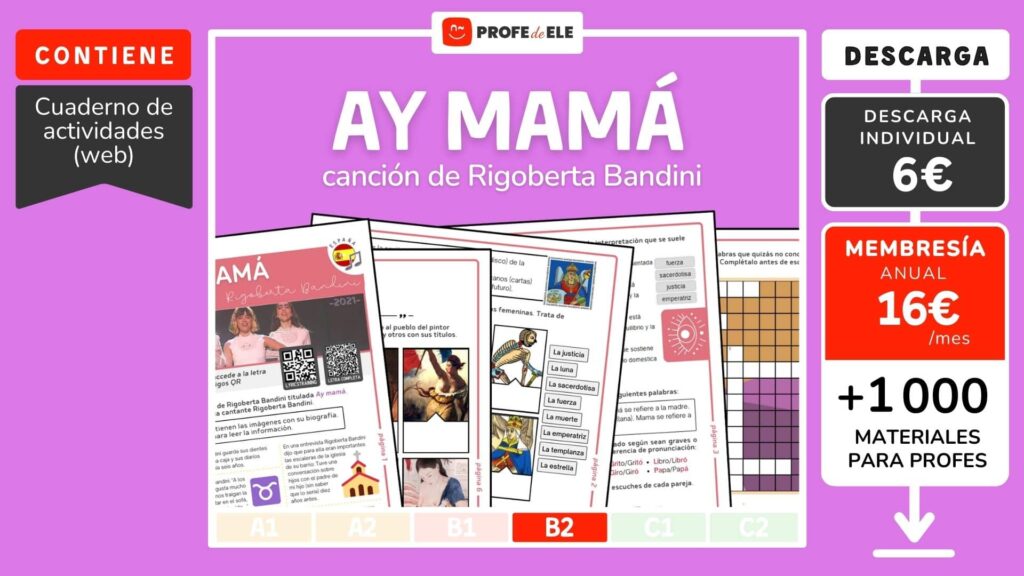 Propuesta de actividades de español de nivel B2 para trabajar el imperativo y el léxico relacionado con el tarot, la maternidad y la censura. Es una explotación didáctica en torno a la canción «Ay Mamá» de Rigoberta Bandini, una artista de España. Se trata de un himno feminista que celebra la maternidad y el poder femenino, especialmente el poder de los pechos femeninos. También critica la sexualización y la censura de estos en la sociedad y en las redes sociales.