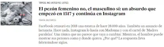 – Buscando en nuestros bancos de imágenes, hemos tardado menos de un minuto en encontrar una imagen del pezón de un hombre. Sin embargo, hemos tardado casi media hora en encontrar el pezón de una mujer. ¿Qué opinas sobre esto?