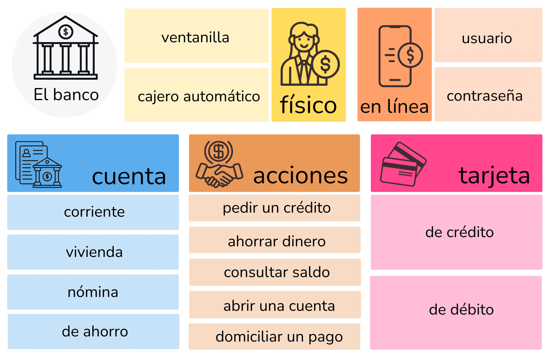 Este cortometraje es una campaña de comunicación realizada por una agencia de publicidad para el Banco Santander para promocionar un nuevo producto. Observa la siguiente infografía que contiene el vocabulario relacionado con el banco. Intenta deducir el significado de las palabras que no conozcas por el contexto y después busca la definición. ¿Cómo se dicen en tu país?