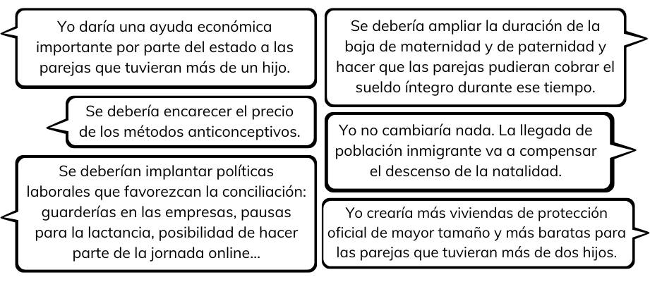 En su país hay un grave problema de natalidad: la tasa de natalidad es una de las más bajas del mundo. Expertos en demografía se han reunido para discutir algunas medidas que ayuden a solucionar esta situación. Lea las siguientes propuestas y, durante dos minutos, explique sus ventajas e inconvenientes; tenga en cuenta que debe hablar, como mínimo, de cuatro de ellas. Cuando haya finalizado su intervención, debe conversar con el entrevistador sobre el tema de las propuestas. Para preparar su intervención, al analizar cada propuesta debe plantearse por qué le parece una buena solución y qué inconvenientes tiene, a quién beneficia y a quién perjudica, si puede generar otros problemas; si habría que matizar algo… |