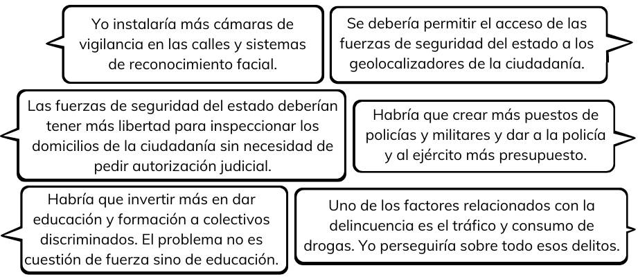 En su país hay un grave problema de seguridad urbana: la tasa de criminalidad en las grandes ciudades es muy elevada. Expertos en seguridad se han reunido para discutir algunas medidas que ayuden a solucionar esta situación. Lea las siguientes propuestas y, durante dos minutos, explique sus ventajas e inconvenientes; tenga en cuenta que debe hablar, como mínimo, de cuatro de ellas. Cuando haya finalizado su intervención, debe conversar con el entrevistador sobre el tema de las propuestas. Para preparar su intervención, al analizar cada propuesta debe plantearse por qué le parece una buena solución y qué inconvenientes tiene, a quién beneficia y a quién perjudica, si puede generar otros problemas; si habría que matizar algo… |