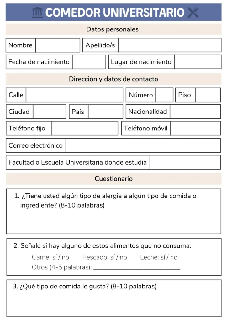 Usted quiere sacar una tarjeta de comedor universitario. Complete el siguiente formulario de la página web de la universidad.