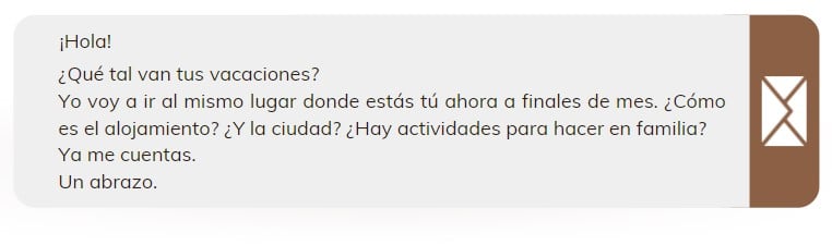 Usted está de vacaciones en una ciudad turística. Un/a amigo/a le escribe para preguntarle cómo es su experiencia de vacaciones allí. Conteste a su amigo/a.
