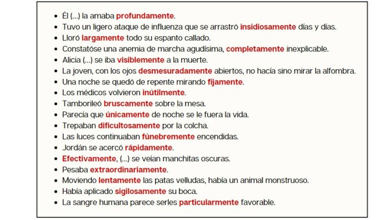 En El almohadón de pluma Horacio Quiroga emplea varios adverbios en -mente. Lee las frases extraídas del texto y después observa la presentación para saber más sobre los adverbios en -mente.