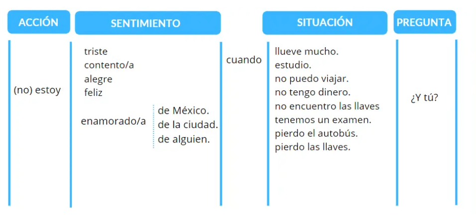 - Actividad 8: Se propone una tabla de producción guiada para expresar emociones en clase oralmente en diferentes situaciones en español. Primero pueden realizar la actividad individualmente o en parejas y, posteriormente, intentar nuevas combinaciones de cómo se sienten ellos en ciertas situaciones. Por ejemplo: «¿Cómo estás cuando vas al cine?». También es una oportunidad para comparar ciertas emociones según la cultura de tu clase: no siempre sienten lo mismo en las mismas situaciones.