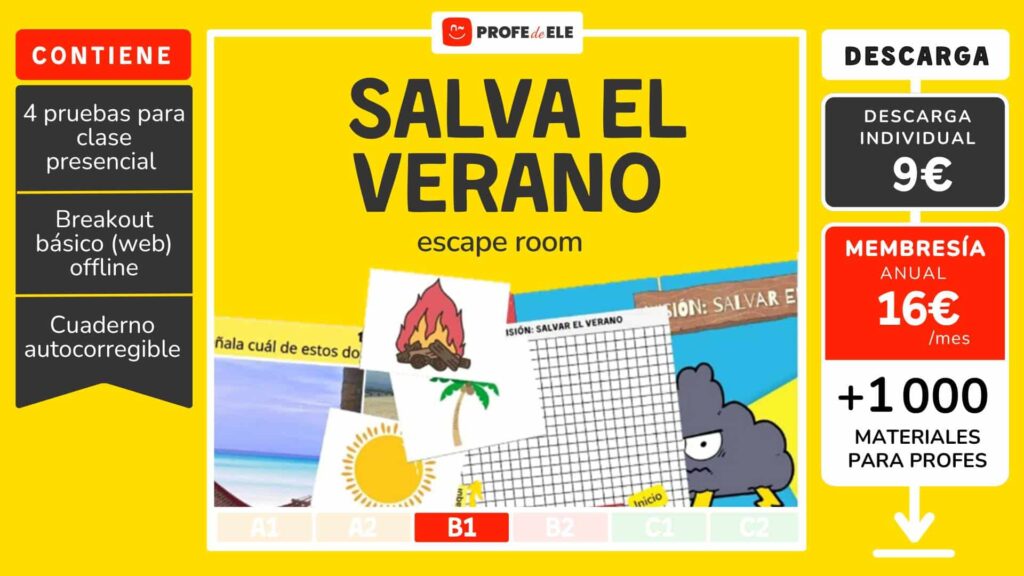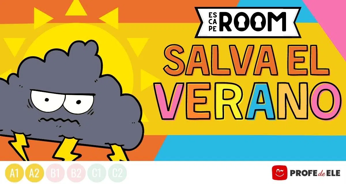 Escape Room de nivel B1 para trabajar temas de cultura y el vocabulario del verano y el clima. Un Escape Room en el campo de la enseñanza de idiomas es una actividad educativa que usa juegos de escape a través de la gamificación e interactividad. Los participantes deben resolver acertijos, pistas y desafíos lingüísticos en un tiempo limitado para «escapar». En este caso, tus estudiantes deben superar 4 pruebas para lograr solucionar el problema que planteamos. Los ejercicios se basan en el vocabulario y estructuras de los niveles A1-A2, de manera que es ideal que el estudiante ya los conozca y se encuentre cursando el B1.