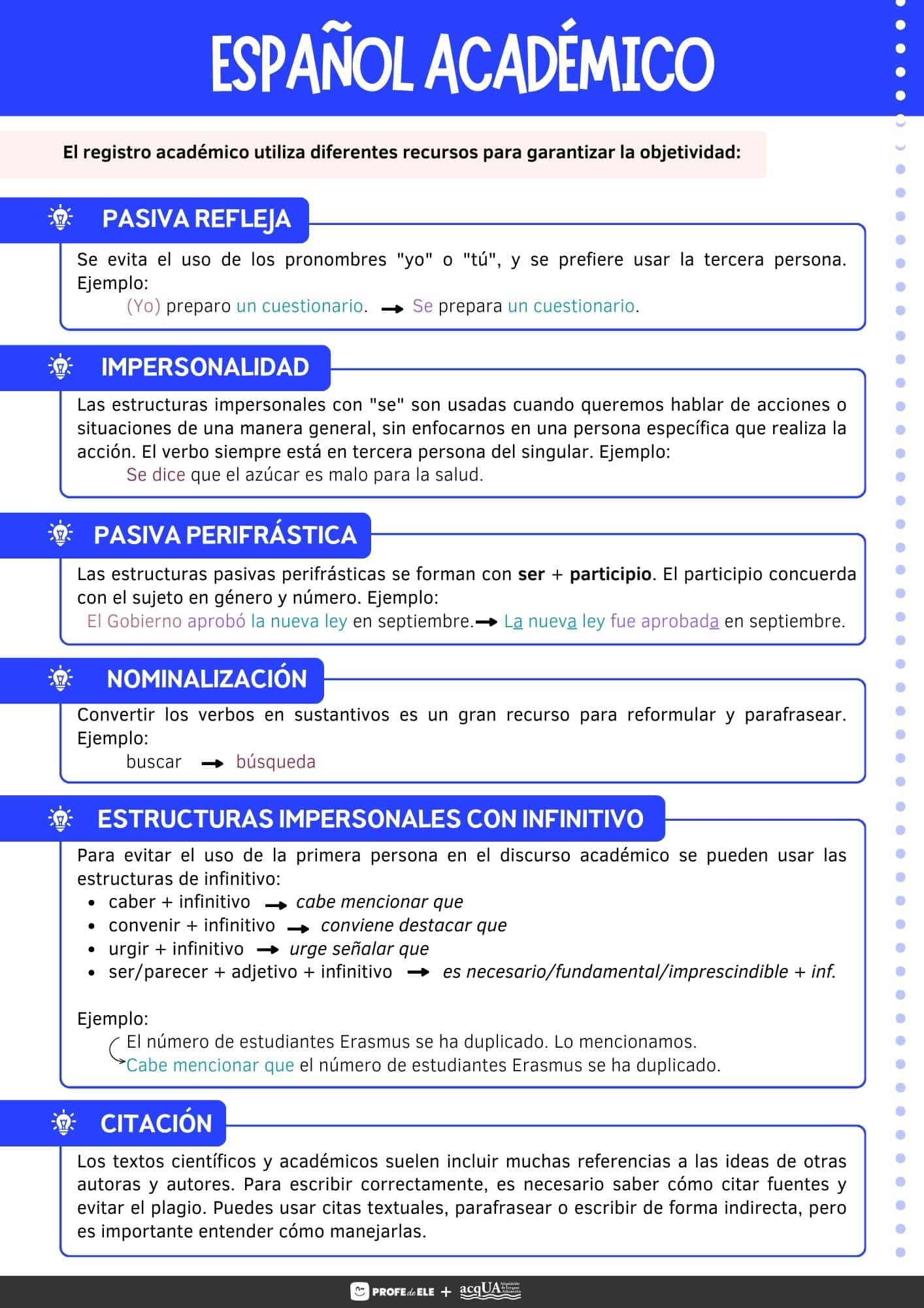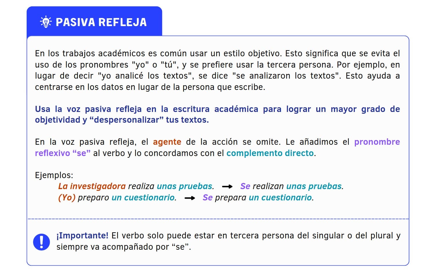 - Actividad 3: Explicación. Infografía con una explicación breve sobre las oraciones pasivas reflejas. Se puede explicar que esta estructura es muy usada en español y que no se utiliza solo en los textos académicos. Es muy recomendable su uso para suavizar el discurso, hacerlo menos directo. Se puede ampliar la actividad pidiendo a tus estudiantes que escriban en un papel un par de frases en primera persona, para después intercambiar estas frases con los compañeros y pedir que las “impersonalicen”. No pasa nada si la frase es de lo más “cotidiana” y no tiene que ver nada con el mundo académico. La frase puede ser tipo “Como zanahoria porque contiene vitamina A”, y que pase a ser “Se come zanahoria porque contiene vitamina A”. También se puede dar una lista de verbos para crear estas frases (por ejemplo, sobre cómo preparar un plato o cómo montar un mueble).