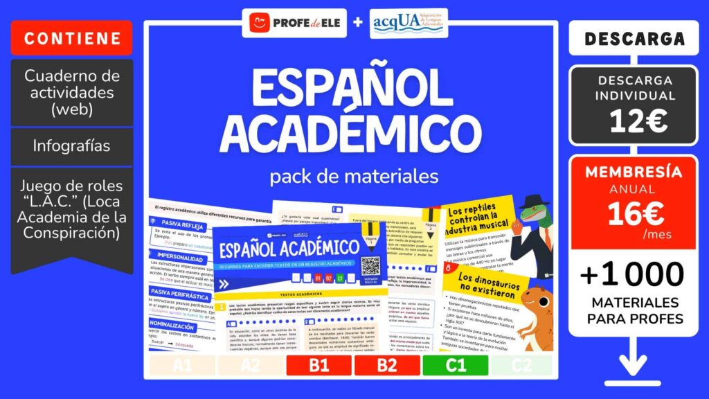El material se compone de una infografía visual con un resumen de los recursos utilizados en el español académico y 21 actividades interactivas. Adicionalmente, en el material descargable se encuentra el cuaderno con las actividades web maquetadas, la infografía en PDF y el juego de roles L.A.C. (Loca Academia de la Conspiración).
