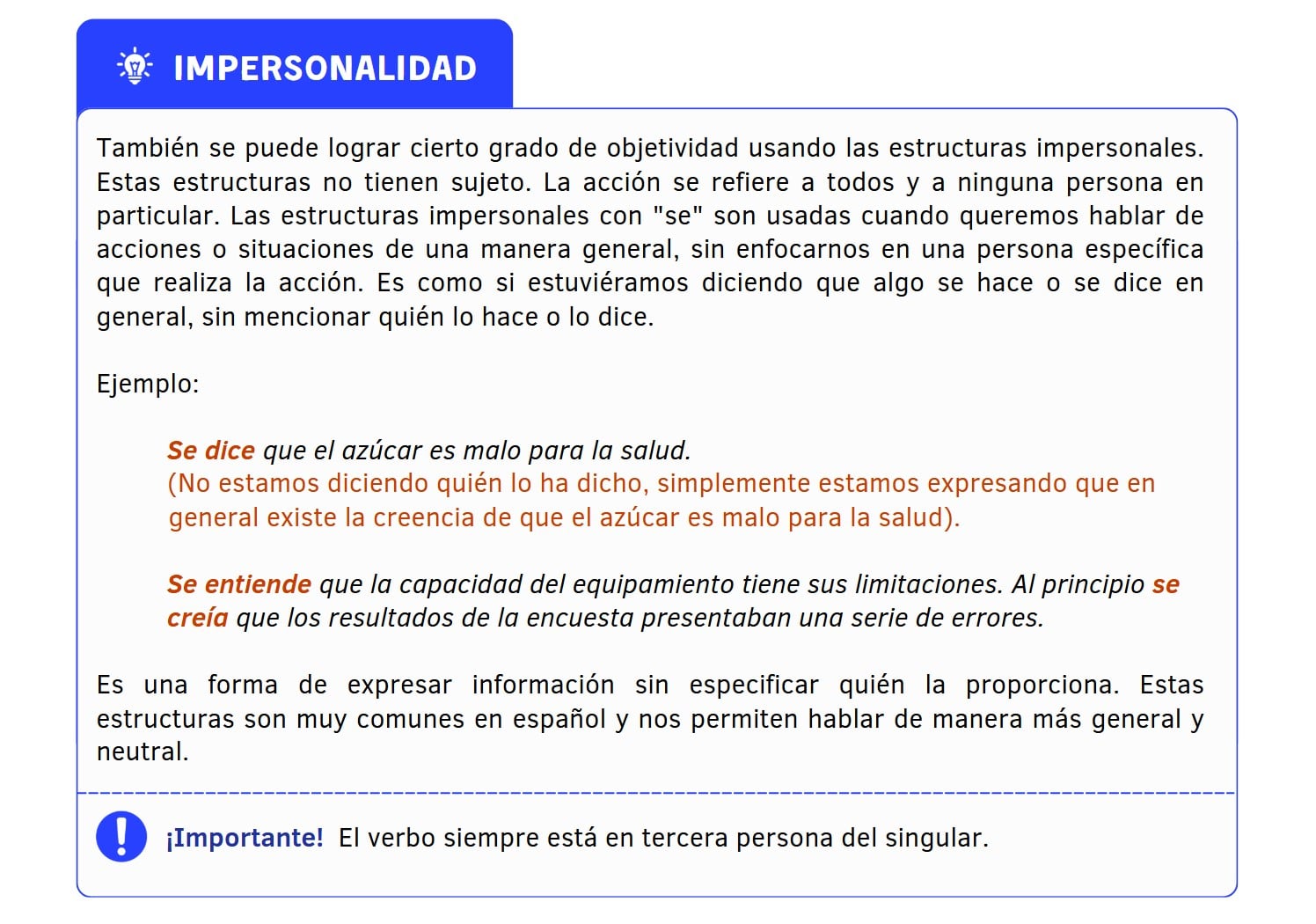- Actividad 7: Explicación. Para ampliar la explicación, se puede recordar un hecho comprobado científicamente, por ejemplo, “La tierra es redonda” y luego añadir una estructura impersonal: “Se dice/se afirma/se comenta/se menciona que la Tierra es redonda”. Pueden poner ejemplos específicos relacionados con su especialidad (medicina, derecho, lingüística, etc.) o algo conocido por todo el mundo.