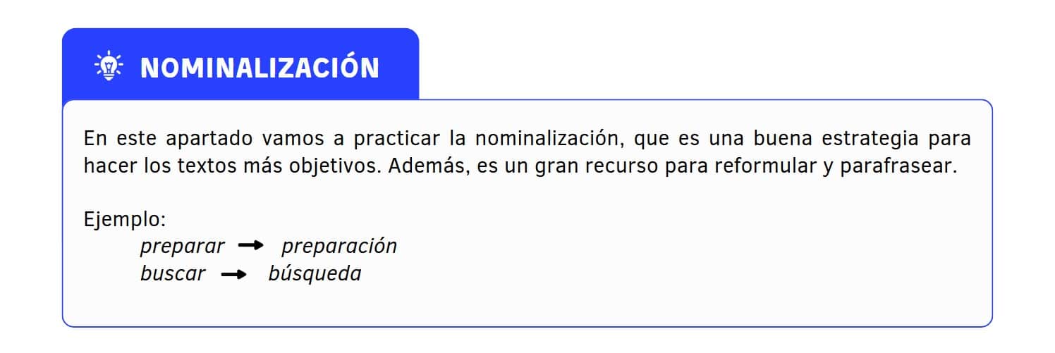 - Actividad 11: De verbo a sustantivo. En este ejercicio se presentan 16 verbos de uso frecuente en contextos académicos que deben nominalizarse. En clases grupales, se puede ampliar la actividad jugando entre dos equipos: uno propone el verbo y el otro tiene que decir el sustantivo. Si el equipo falla, entonces el primer equipo tiene que decir cuál era la respuesta correcta.