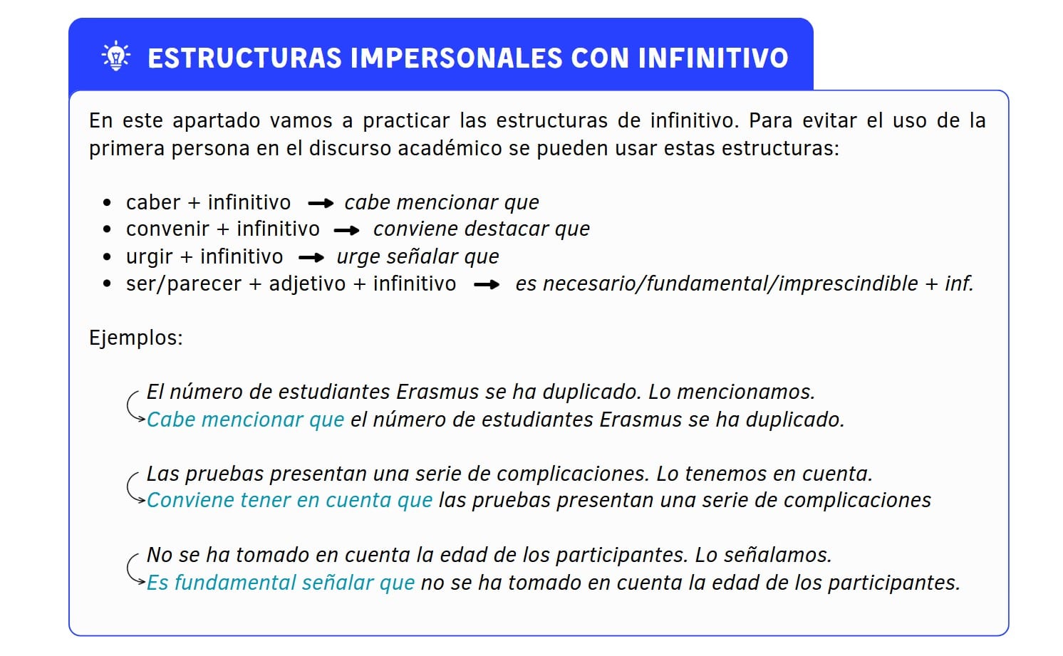 - Actividad 13: Explicación. Recuerda a tus estudiantes que, a la hora de escribir un texto académico, se recomienda tener a mano una especie de cuadro o lista con este tipo de estructuras para poder incorporarlas en los textos. También se puede pedir buscar estructuras con infinitivo en los textos académicos que estén leyendo actualmente y traer ejemplos a clase.