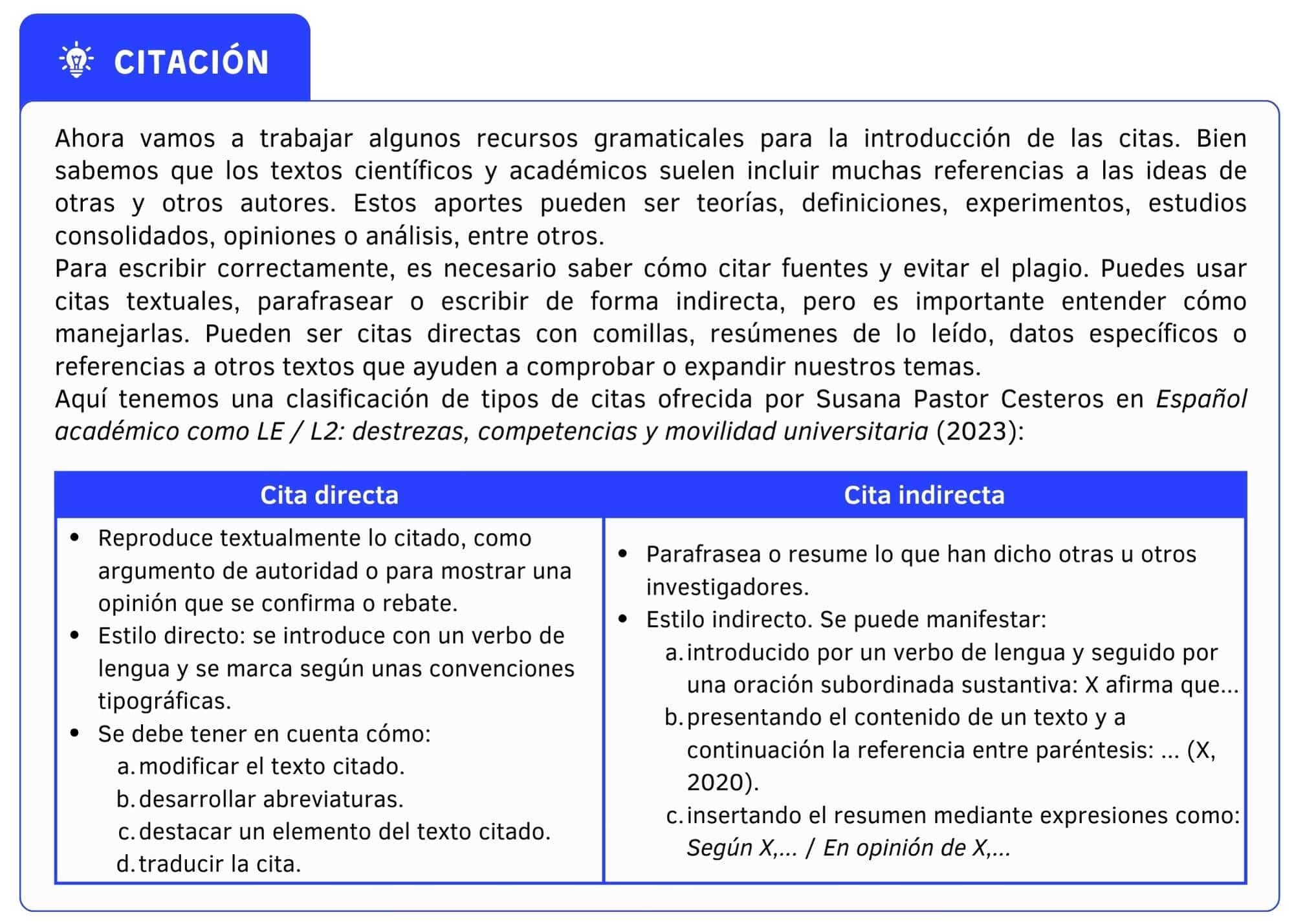 Un recurso muy utilizado en los textos académicos son las citas a otras autoras o autores. ¿Sabes citar correctamente en tu lengua? Lee la siguiente tabla resumen sobre cómo citar en español: