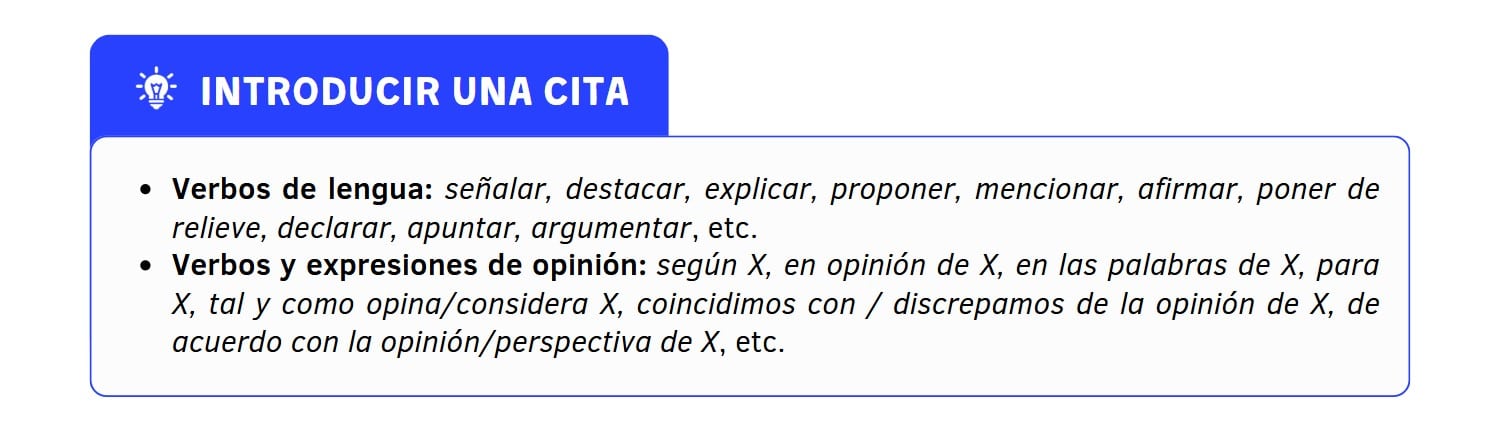 Presta atención a los recursos para introducir las citas señalados en negrita en la actividad anterior. Aquí tienes una lista de verbos y frases que puedes utilizar para introducir una cita: