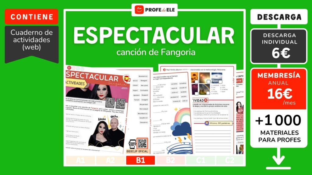 Vas a completar la letra de Espectacular de Fangoria. Según qué quieras practicar te proponemos dos itinerarios. Si quieres practicar el futuro, sigue el primer itinerario (columna de la izquierda en el ordenador) y si quieres practicar el vocabulario del tiempo atmosférico, sigue el segundo itinerario (columna de la derecha en el ordenador).