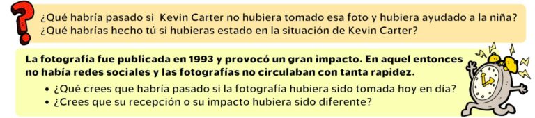 Vamos a centrarnos en la foto de la hambruna en Sudán. En esa foto aparece una niña (años después se supo que era niño) con un buitre a sus espaldas. Impresiona, ¿verdad? La fotografía fue tomada por un fotógrafo llamado Kevin Carter. Visualiza este vídeo para saber más sobre cómo se hizo esta foto.