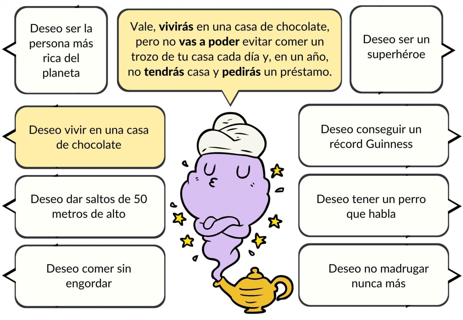 ¿Ya conoces al genio travieso? Siempre concede los deseos con algún pero. Ahora mismo no tiene tiempo para concederlos todos… ¿le ayudas? Concede los deseos utilizando vale, pero…
