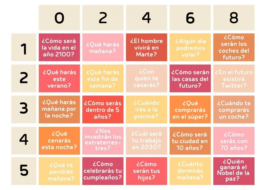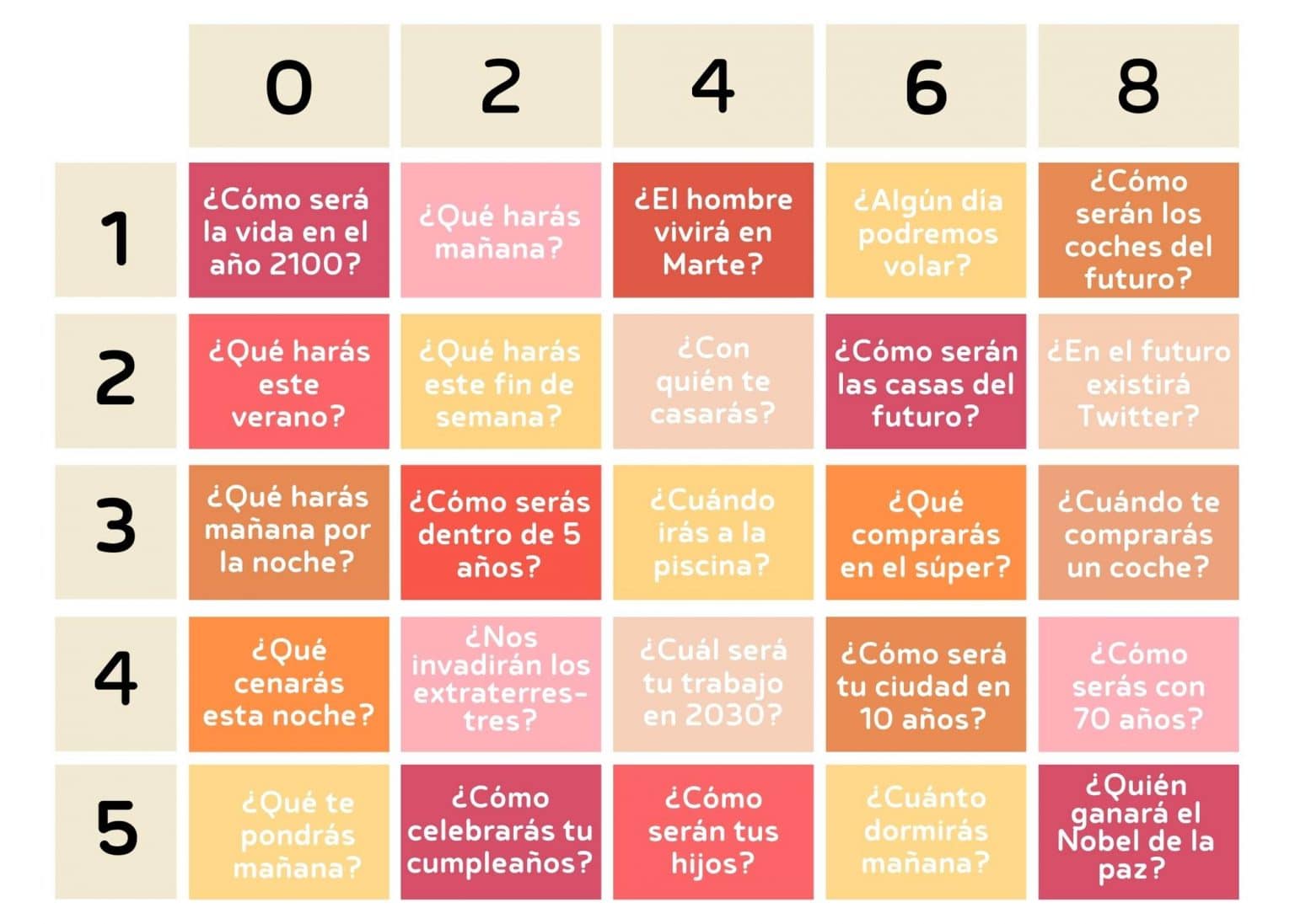 – Las relaciones de pareja – Las redes sociales – Los parques de atracciones – Los deportes – Las películas – Los videojuegos –