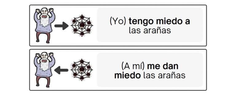 – Tengo miedo a/de + sustantivo (Tengo miedo a/de las arañas). El sujeto es la persona que experimenta la sensación.
