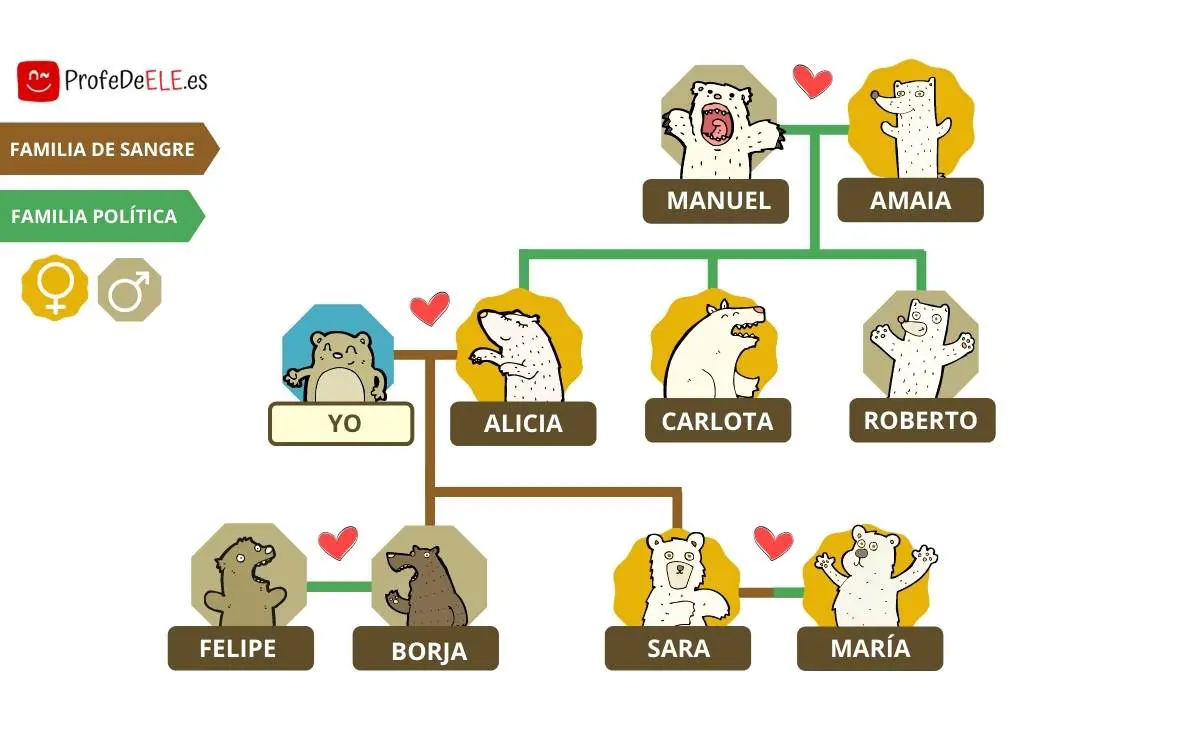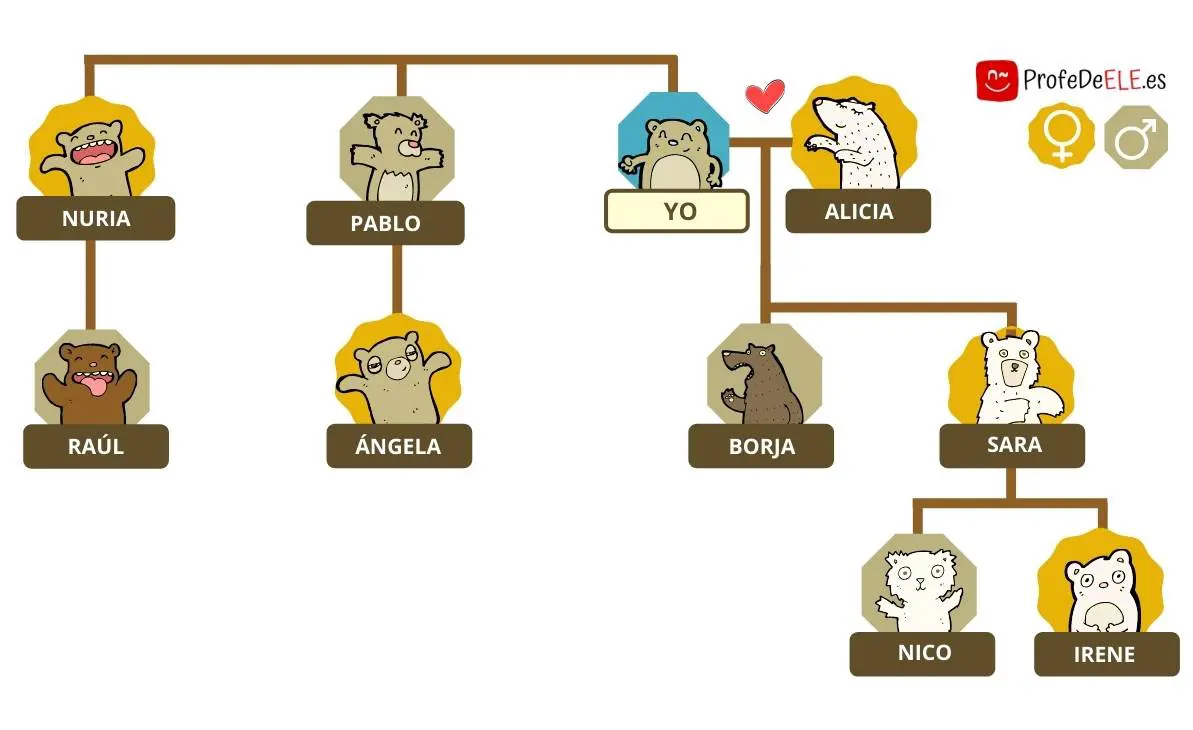 - Actividad 3. En este ejercicio se incluye un contenido cultural mientras van a practicar el vocabulario pasivo. Tus estudiantes deben responder a las preguntas a partir del árbol geneálogico.