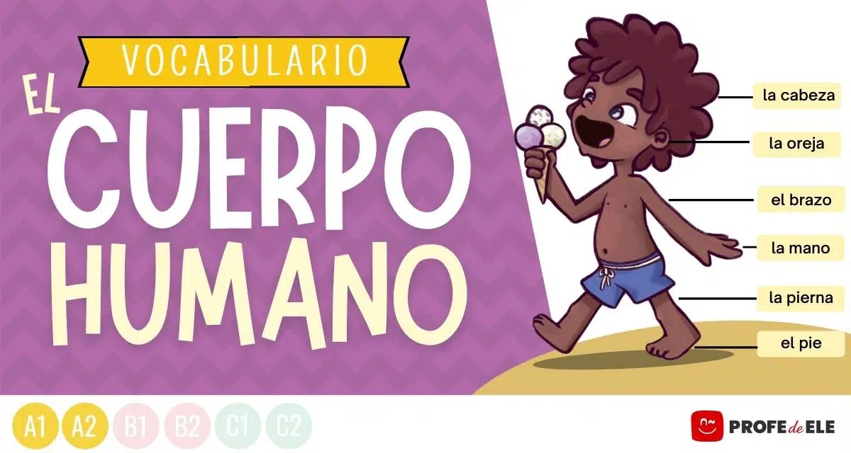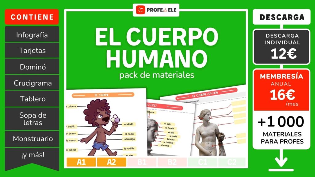 Actividades de español nivel A1-A2 para aprender léxico y gramática relacionado con el cuerpo para la clase de español en la que se trabaja principalmente la comprensión auditiva, la expresión escrita y la expresión oral a través de 12 actividades interactivas online. Es un recurso completo y dinámico para alumnos de Español como Lengua Extranjera (ELE) de nivel inicial (A1-A2).