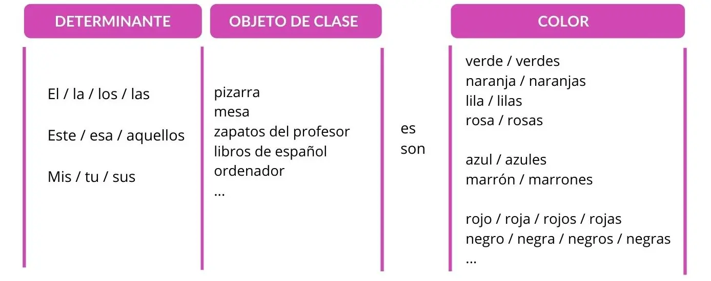 | ¿De qué color son las cosas de tu alrededor? Graba tu respuesta. Después puedes mostrarle la grabación a tu profesor/a. Ejemplos: – Mi bolígrafo es de color azul. – Estas mesas son marrones. – La camiseta de mi compañero es roja. |