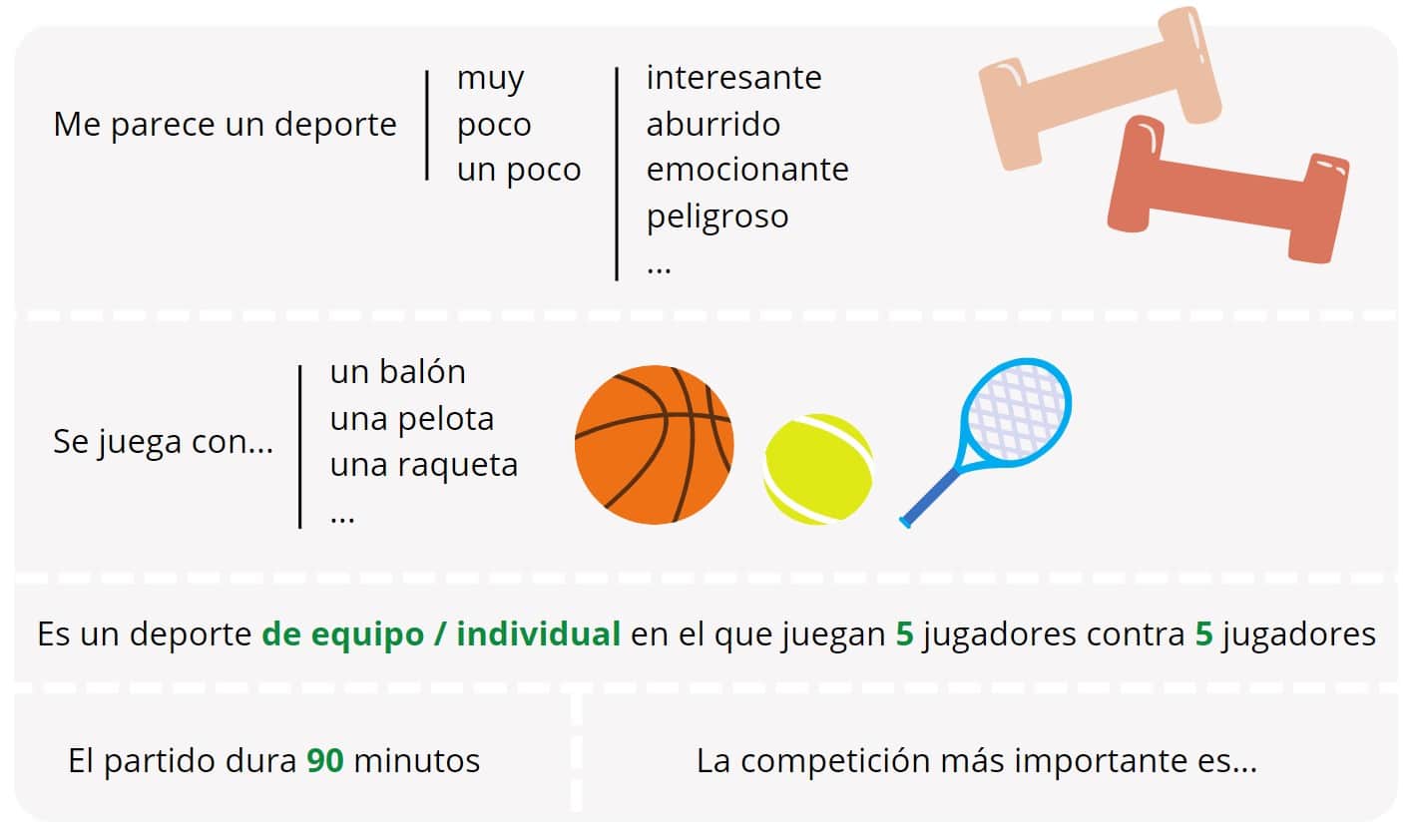 Escucha las descripciones de los deportes y haz clic en el deporte correcto. Si no entiendes todo, ¡no te preocupes! Escucha bien las palabras clave. Te recomendamos anotarlas en un papel.