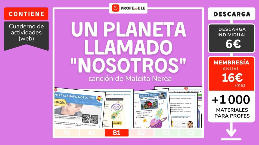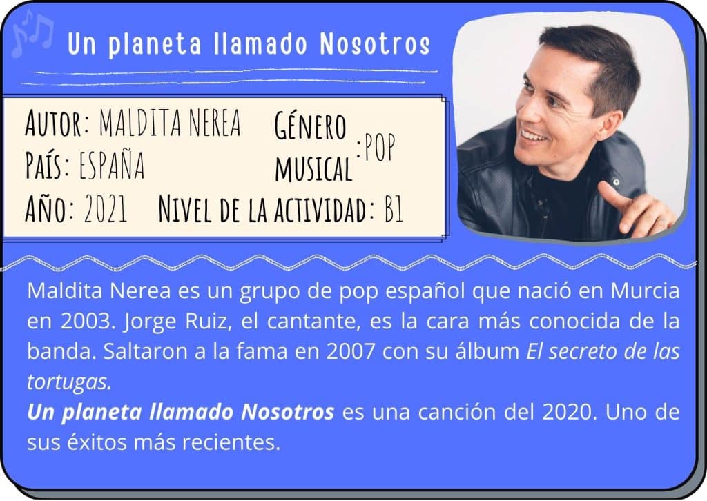 A continuación vas a escuchar una canción titulada Un planeta llamado Nosotros del grupo español Maldita Nerea. Completa las actividades interactivas correspondientes.