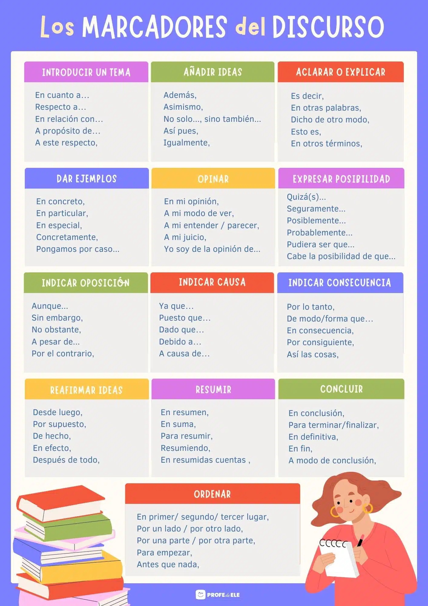 Los marcadores o conectores del discurso son elementos que ayudan a interpretar el texto. Existen diferentes tipos según su función: