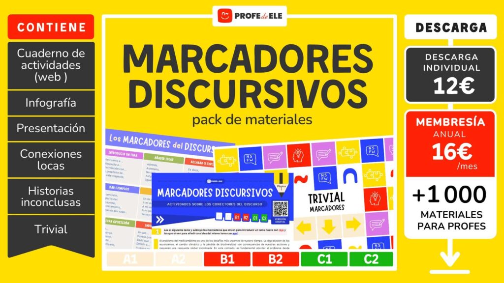 El material se compone de una infografía visual de los marcadores discursivos en español que corresponden a los niveles a partir de B1, 14 actividades interactivas y un video (tapa de español). Adicionalmente, en el material descargable, se encuentra el cuadernillo con las actividades en versión impresa, un juego de mesa tipo trivial, un imprimible de historias cortas para trabajar la comprensión y expresión escrita y un juego de cartas sobre conexiones locas para explotar la interacción oral.