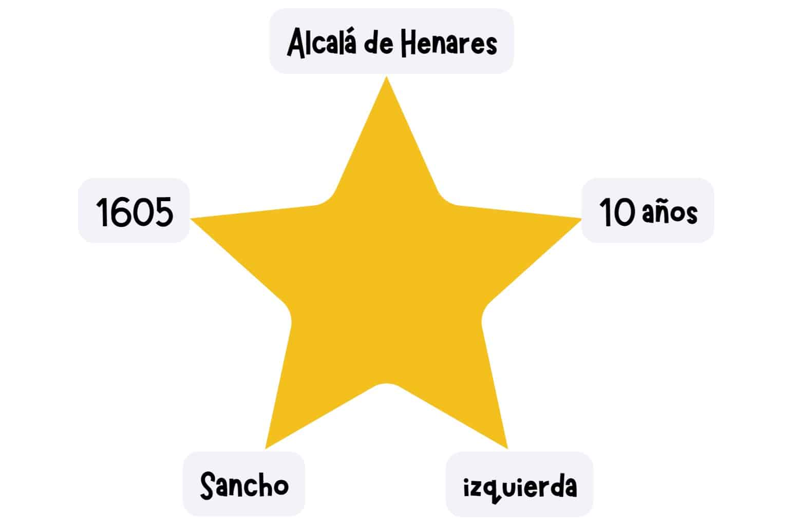 En cada punta de esta estrella hay un dato relacionado con Miguel de Cervantes y el Quijote. ¿A qué hace referencia cada dato? Debate con tus compañeros/as y haced vuestras apuestas. Después, completa la actividad de debajo para descubrir la solución y saber más sobre el tema.