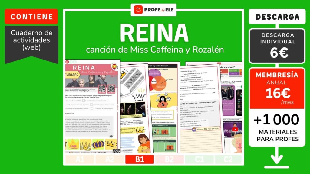 Propuesta de actividades de español de nivel B1 para practicar el tema del futuro, el acoso escolar y el vocabulario relacionado a través de la canción «Reina» de Miss Caffeina y Rozalén, artistas de España. Esta propuesta trabaja la comprensión y la expresión, tanto oral como escrita, a través de 12 actividades interactivas. Las actividades están dirigidas a alumnos de Español como Lengua Extranjera (ELE) de nivel intermedio (B1).