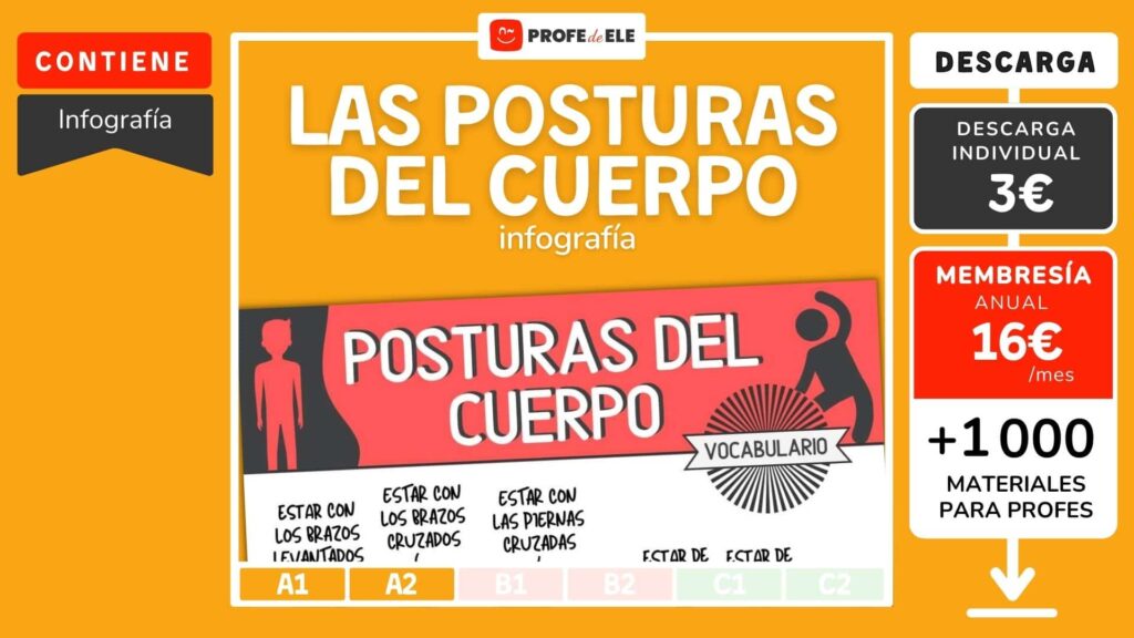- Explicación. Tus estudiantes podrán ver la infografía visual y practicar a construir una oración con las palabras nuevas o a señalar qué posturas tienen ahora mismo. Además, con este léxico, se trabaja la conjugación del verbo «estar» y se puede relacionar fácilmente con los verbos en imperativo para dar instrucciones u órdenes.
