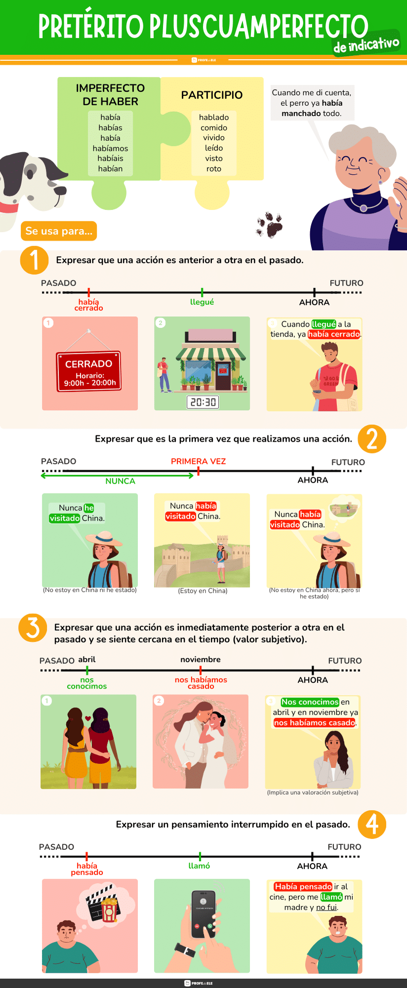 Comenzarás explorando una infografía completa que te proporciona una visión integral del pretérito pluscuamperfecto en español. A continuación, podrás poner en práctica lo aprendido con dos actividades de rellenar espacios que se enfocan en el uso del pretérito pluscuamperfecto. Estas actividades te desafiarán a usar este tiempo verbal, uno de los principales tiempos del modo indicativo, en diferentes contextos, ayudándote a familiarizarte con su estructura y aplicación.