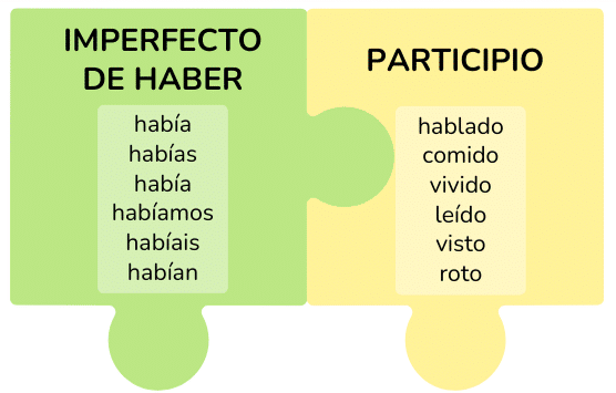 El pretérito pluscuamperfecto del modo indicativo es un tiempo verbal compuesto por el verbo auxiliar haber conjugado en pretérito imperfecto de indicativo más el verbo principal en participio (forma no personal del verbo).