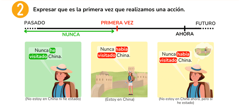 También es frecuente utilizar este tiempo verbal para expresar que es la primera vez que realizamos una acción, acompañado del adverbio de frecuencia “nunca”.