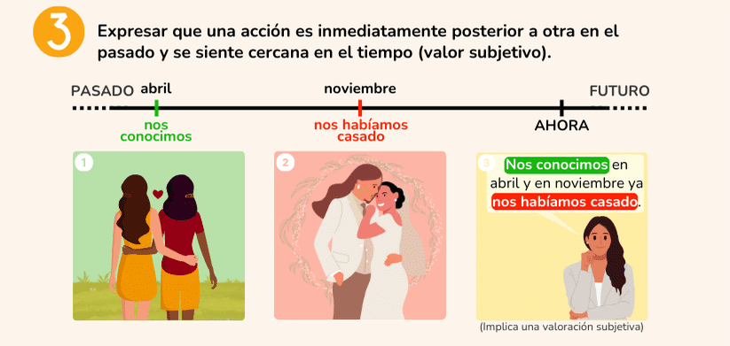 Adicionalmente, puede expresar que una acción es inmediatamente posterior a otra en el pasado con un valor subjetivo.