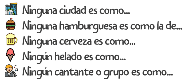 Por ejemplo: Ninguna ciudad es como Bilbao. Es moderna, no es muy grande y tiene el mar y el monte al lado.