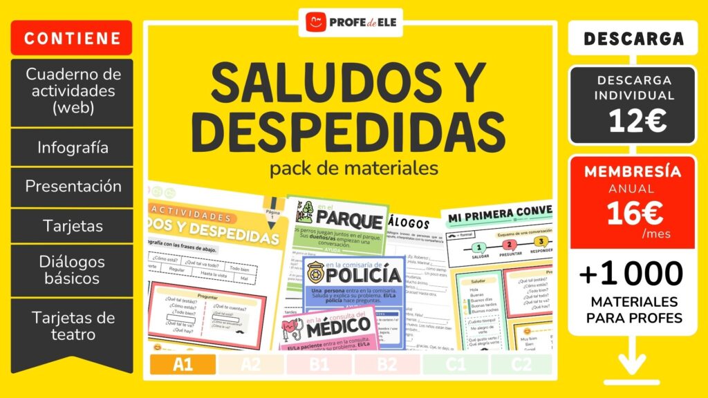 En la descarga encontrarás la presentación, la infografía, un cuaderno con las actividades de la web, 48 fichas con fórmulas de saludos y despedidas en español (las trabajadas en esta unidad y algunas nuevas), 6 diálogos simples para completar y 12 tarjetas con situaciones y ejemplos para interpretar teatros básicos de nivel A1.