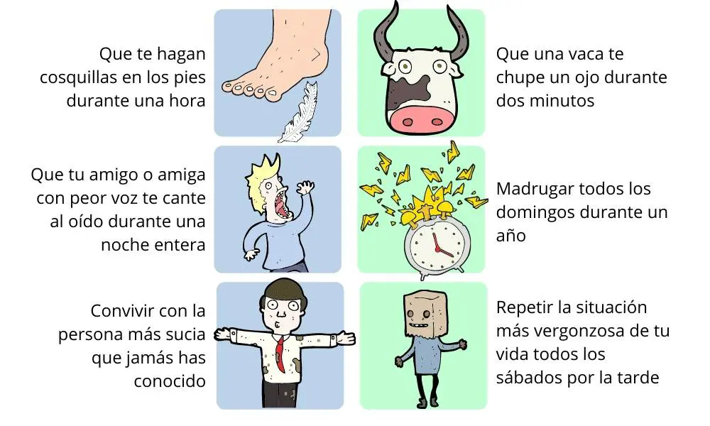 Imagina que no tienes otra opción y tienes que elegir entre una de estas torturas. ¿Cuál eliges: la azul o la verde? Discute con tus compañeros cuál de las siguientes torturas preferirías sufrir y por qué.