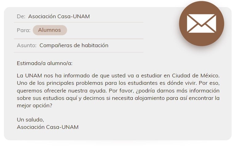 Usted ha recibido un mensaje de la asociación de estudiantes Casa-UNAM de la Universidad Nacional Autónoma de México (UNAM) y va a responderlo.