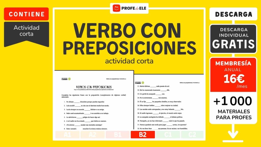 El material descargable incluye un ejercicio de rellena huecos en el que hay que poner la preposición correcta que acompaña al verbo, editado en pdf. Esta actividad ofrece dos ejercicios diseñados para explorar este tema de manera gradual y efectiva en nivel B2: