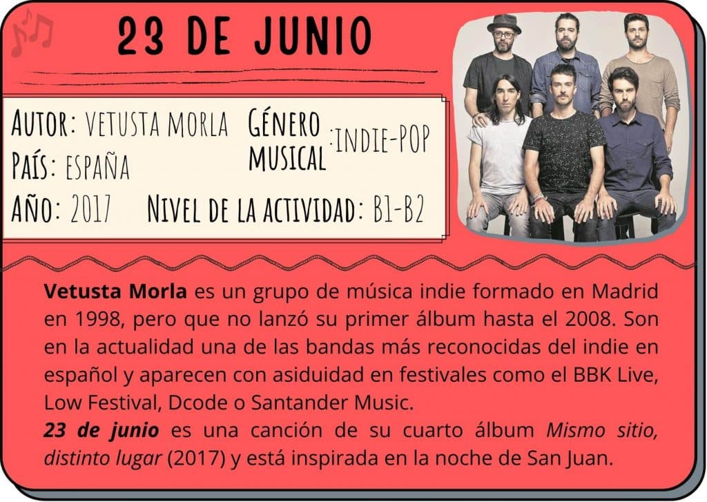 A partir de la ficha informativa, de la página web oficial del grupo, de su página en Wikipedia y de la siguiente entrevista a la directora del videoclip del tema 23 de junio señala dos informaciones falsas entre las siguientes sobre Vetusta Morla y la canción 23 de junio.